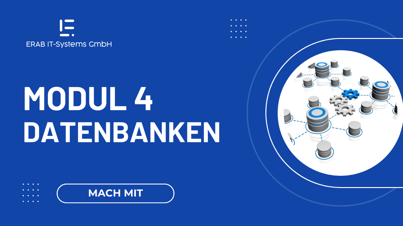Mit dem 4. Modul erhält der Teilnehmende umfassendes Wissen bzgl. der Datenbanken. Hierzu gehört die Schaffung der Grundlagen, die Datenbank-Administration, SQL-Programmierung, Big Data und NoSQL-Datenbanken sowie die Datenbank-Entwicklung.