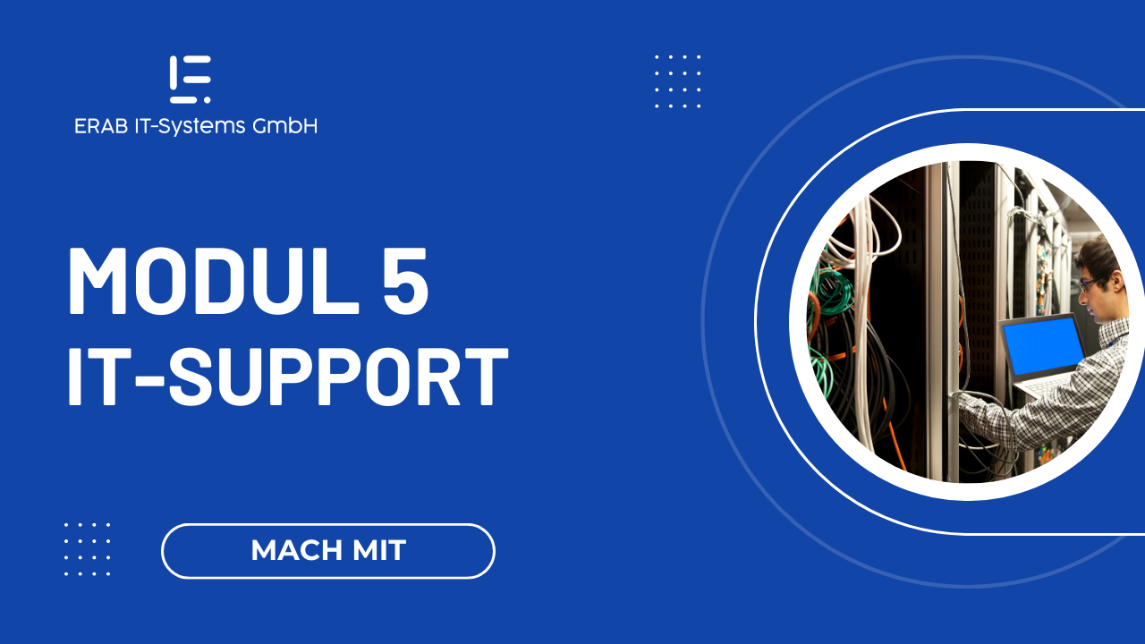 Das 5. Modul ermöglicht dem Teilnehmenden das umfangreiche Wissen rund um den IT-Support. Neben den Grundlagen und der Technologie geht es hierbei auch um die Kundenorientierung sowie Kommunikation.